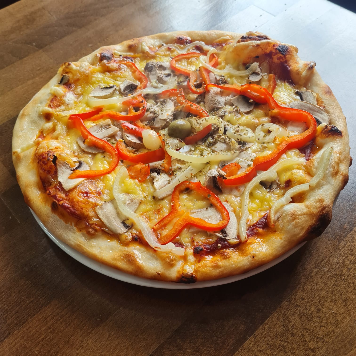 Pizza Vegetriana – crvena paprika, žuta paprika, šampinjoni, biljni sir i pica sos.